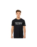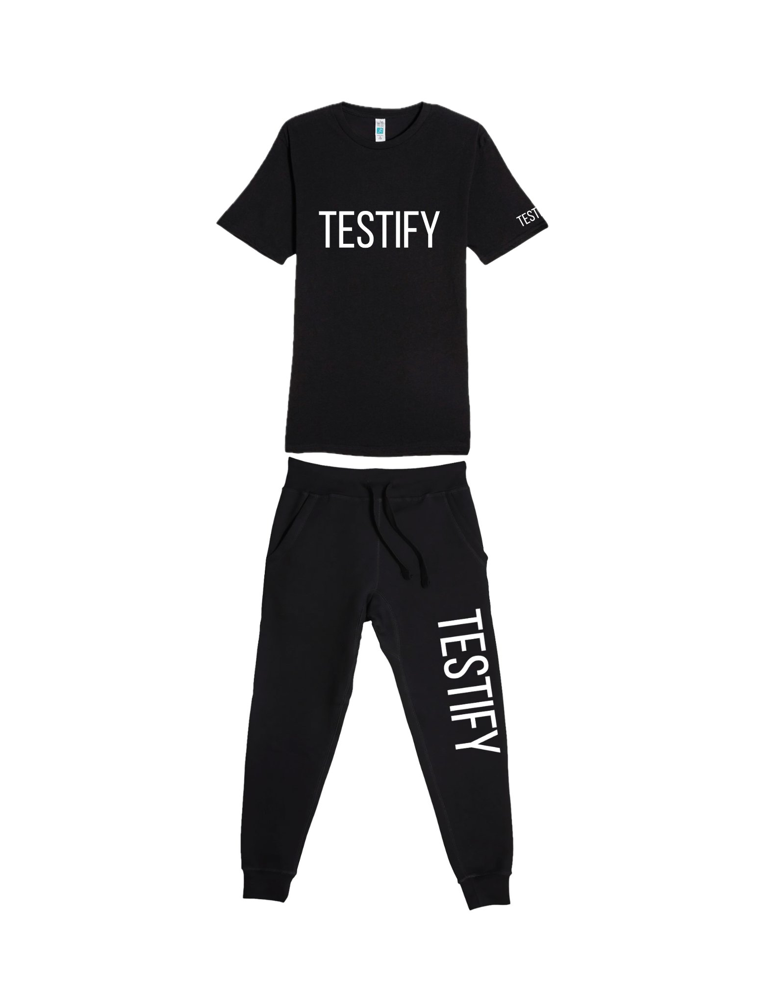 The front of the T-shirt and jogger boldly states “Testify,” with a matching imprint on the left sleeve.